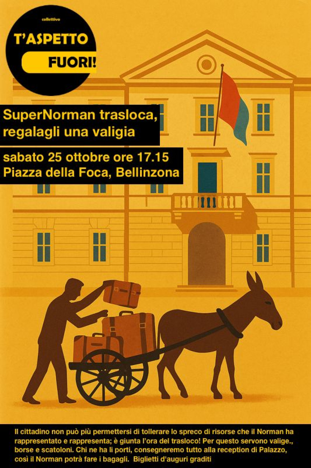 Sabato 25 ottobre alle 17.15 in Piazza della Foca a Bellinzona è previsto un evento dal titolo provocatorio: “SuperNorman trasloca!”, organizzato dal collettivo "T'aspetto fuori!" che, con toni ironici e provocatori, chiede le dimissioni del consigliere di Stato Norman Gobbi.
